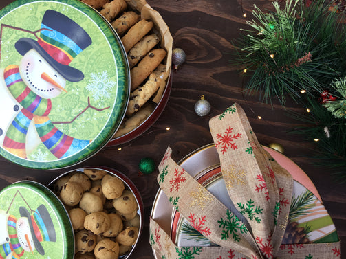 Give the gift of a tin filled with cookies! Our cookie tins are a little fancier than just the regular box we send, and they are perfect for giving as gifts as they stay fresh for a longer time, and the tins are reusable! A tin filled with assorted cookies includes a plain ribbon or holiday ribbon. You may also request and gift message!